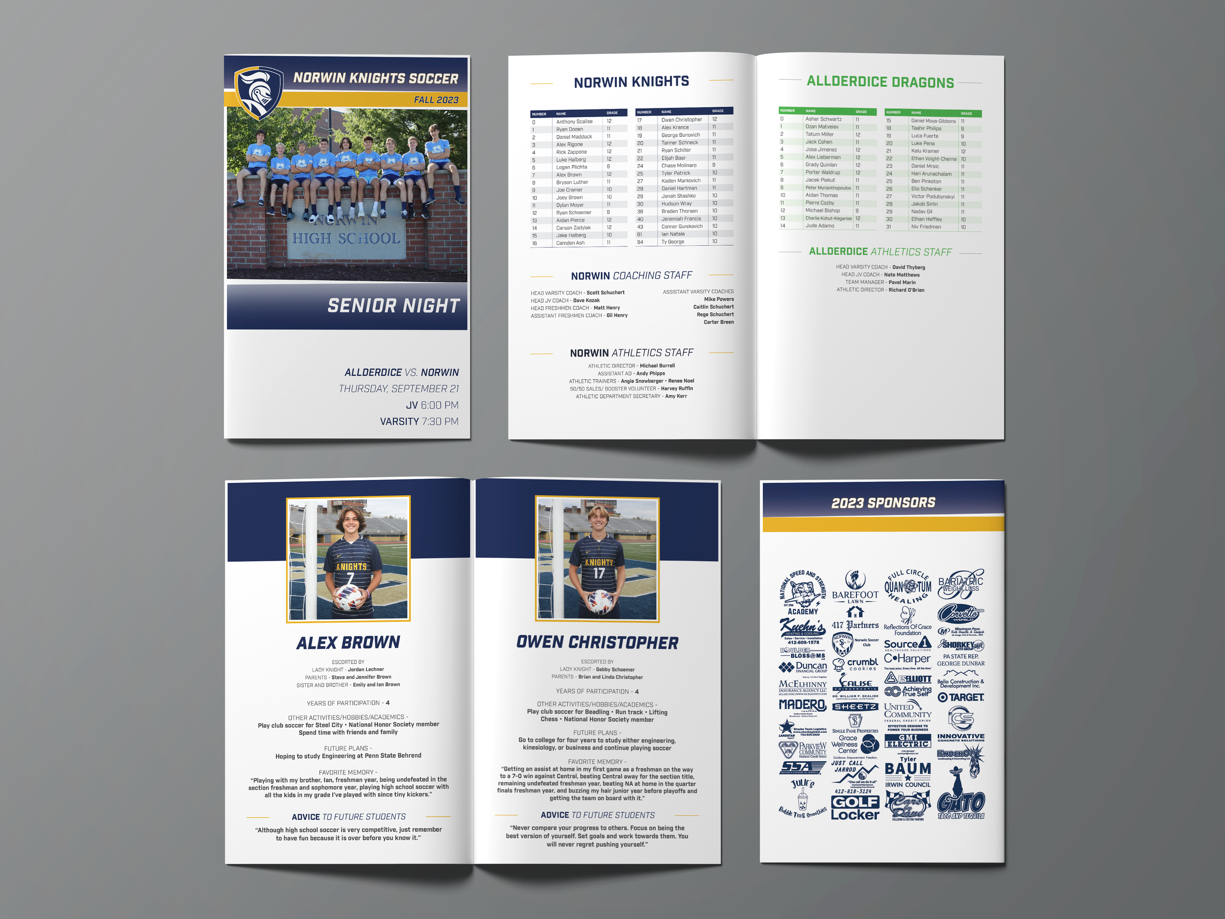 I created programs for every home game, which included information on the time of the event, the full player rosters for both teams, as well as each team’s coaching and athletic staff. For the senior night programs, additional pages were added to highlight a brief biography and the goals of each Norwin senior.